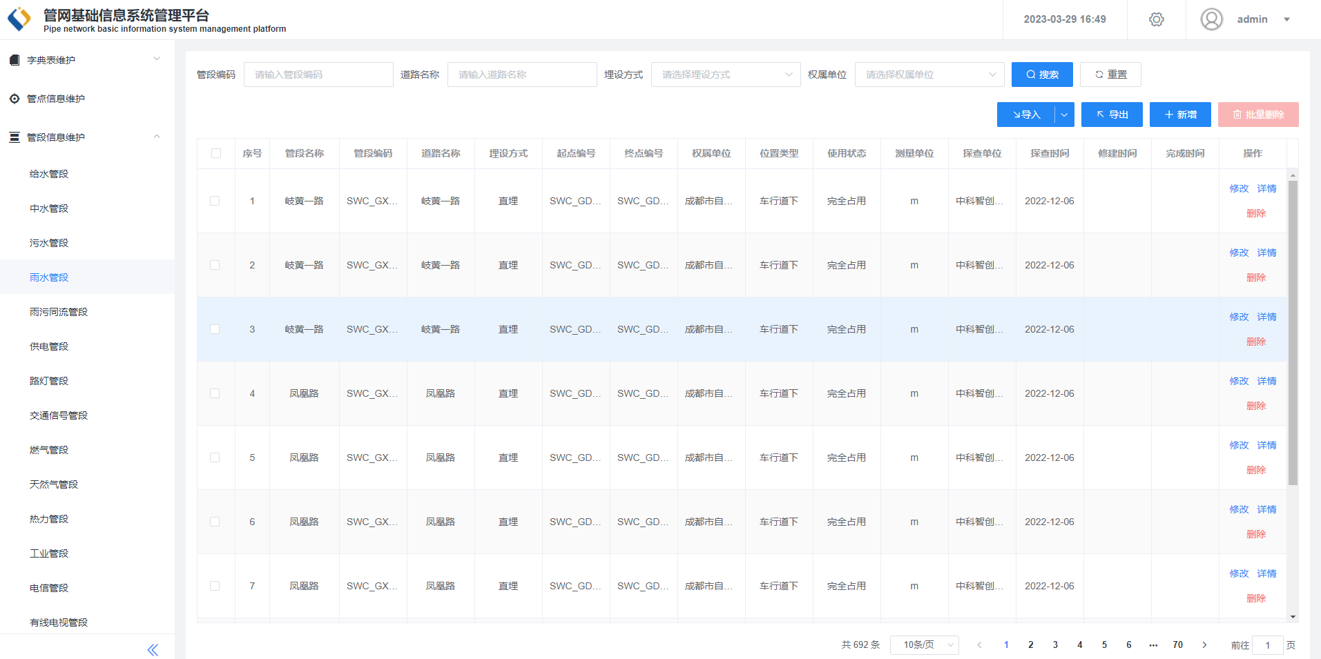 記錄管理管網(wǎng)基礎(chǔ)數(shù)據(jù),包括管點(diǎn)數(shù)據(jù)、管段數(shù)據(jù)、附屬設(shè)施數(shù)據(jù)等,按照國(guó)家管網(wǎng)數(shù)據(jù)標(biāo)準(zhǔn)格式記錄數(shù)據(jù),使城鎮(zhèn)管網(wǎng)元數(shù)據(jù)數(shù)字化,可通過(guò)API輸出json格式的管網(wǎng)基礎(chǔ)信息數(shù)據(jù)。系統(tǒng)通過(guò)管網(wǎng)基礎(chǔ)信息數(shù)據(jù)自動(dòng)生成管網(wǎng)地圖。